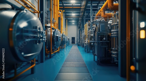 industrial, factory, interior, pipe, tank, machinery, equipment, metal, steel, blue, yellow, orange, corridor, hallway, pathway, technology, manufacturing, processing, production, industry, engineering, modern, clean, bright, lighting, perspective, depth, space, architecture, design, geometric, line, shape, texture, background, abstract