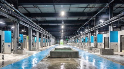 infrastructure, long, operational, pipe, interior, structure, equipment, daylight, factory, industrial, building, system, machine, steel, row, production, lighting, automation, processing, facility, maintenance, pool, blue, modern, tank, hall, cleanliness, roomy, clean, concrete, large, water, manufacturing, bright, flooring