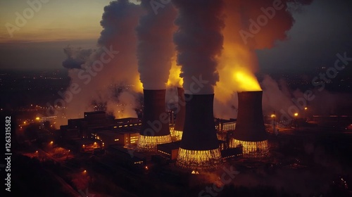 factory, industrial, smoke, night, evening, darkness, manufacturing, production, work, occupation, nocturnal, urban, city landscape, landscape, architecture, building, structure, smokestack, chimney
