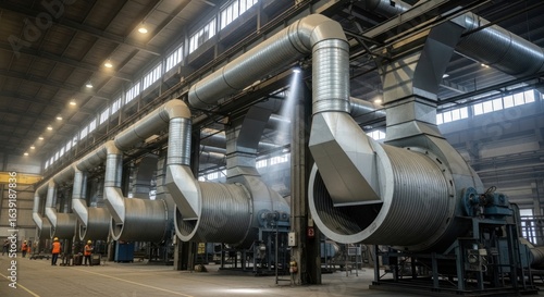 factory, industrial, interior, metal, cylinder, ventilation, system, pipe, machinery, equipment, manufacturing, production, men at work, industry, steel, grey, silver, large, long, tube, infrastructure, engineering, technology, building, warehouse, workspace, construction, heavy, process, plant, energy, power, air, refinery, factory, industrial building