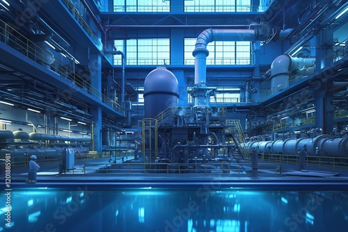 factory, industrial, machinery, equipment, plant, technology, manufacturing, production, engineering, industry, infrastructure, building, architecture, interior, design, metal, steel, pipe, tube, energy, power, electricity, automation, process, system, men at work, technician, operator, maintenance, safety, control, room, space, large, complex, modern, futuristic, blue, dark, light, water, floor, scene, image, photo, picture