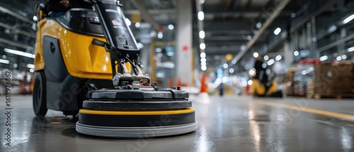 Industrial floor cleaning machine polishing concrete surface in warehouse Concept of hygiene, maintenance, and professional cleaning service