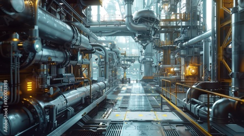 factory, industrial, structure, pipe, steel, metal, futuristic, science, fiction, technology, machinery, engineering, tube, apparatus, platform, paseo, catwalk, iron, stainless, grey, silver, blue, orange, yellow, bright, dark, light, complex, intricate, modern, abstract, design, architecture, construction, hardware, three-dimensional, rendering, digital, art