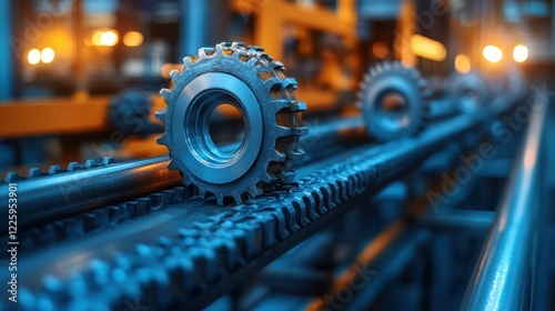 gear, machinery, metal, industry, manufacturing, factory, technology, engineering, production, industrial, mechanic, mechanism, cog, wheel, machine, equipment, tool, system, assembly, process, automation, component, part, hardware, steel, blue, dark, closeup, detail, texture, sharpened, sharp, depth, background, blur, lighting, motion, work, precision, design