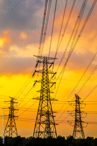 china, asia, high, power, tower, voltage, energy, electricity, industry, tall, pillar, metal, steel, pylon, link, transmission, line, cable, wire, building, facility, structure, environment, background, landscape, silhouette, modern, business, commercial, travel, destination, nobody, rural, summer, cloud, sky, sunset, dusk, black, orange, blue, red, yellow, sun, light, nature, flow, horizon, many