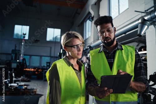 man, caucasian, woman, african american, engineer, check up, industry, colleague, talk, biracial, technology, metal, workshop, waist up, factory, protective, work, production, construction, men at work, technician, portrait, people, job, manufacture, mechanic, goggles, industrial, heavy, control