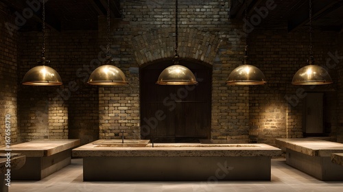 Industrial interior space with exposed brick walls and warm brass pendant lights.