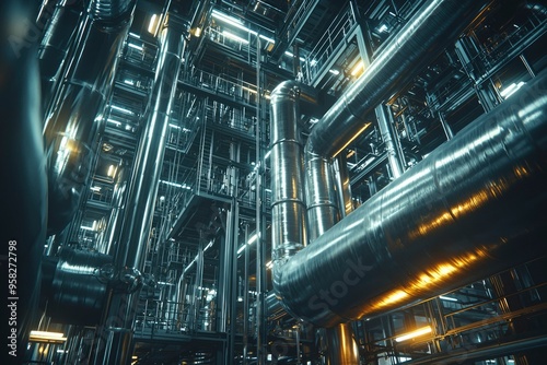 industrial, interior, pipe, piping, metal, steel, structure, catwalk, platform, scaffolding, framework, infrastructure, machinery, factory, plant, workshop, production, manufacturing, engineering, technology, modern, futuristic, design, construction, light, shadow, detail, texture, pattern, abstract, background, image