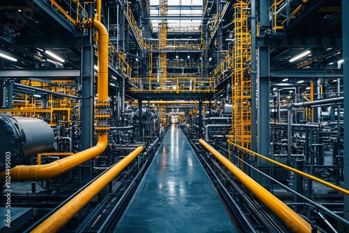 industrial, interior, factory, pipe, yellow, steel, metal, paseo, pathway, platform, structure, machinery, equipment, infrastructure, complex, intricate, network, system, grid, line, pattern, geometric, abstract, modern, technology, engineering, construction, design, lighting, light, shadow, reflective, floor, concrete, dark, grey, clean, empty, perspective, depth, space, contrast, light, shadow, detail