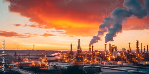 industrial landscape featuring an oil refinery against the backdrop of a vibrant sunset, with flames and pipes. Generative AI