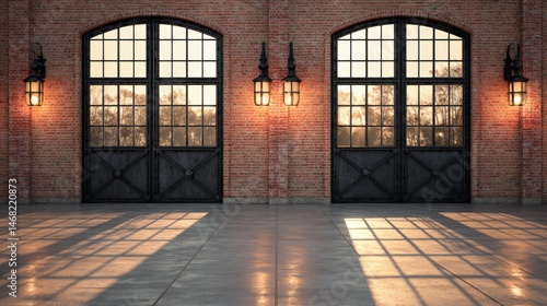Industrial Loft Setting Red Brick Wall with Black Metal Doors and Warm Sunlight
