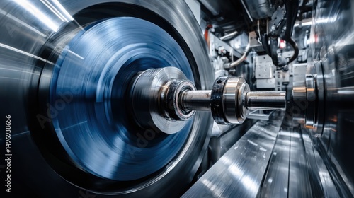 Industrial machine spinning aluminum wheel with motion blur, engineering concept