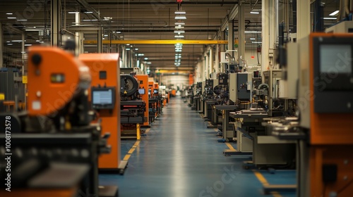 factory, industrial, machinery, manufacturing, industry, machine, equipment, production, metal, steel, automated, automation, technology, engineering, plant, warehouse, interior, empty, deserted, no, people, clean, organised, modern, corridor, aisle, perspective, light, shadow, line, robot, robotic, metalworking, heavy, precision, component, part, assembly, workshop