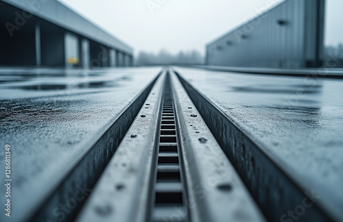 industrial, perspective, closeup, architecture, infrastructure, linear, metallic, track, symmetry, engineering, technology, transport, steel, urban, design, modern, geometric, smooth, surface, cold, rain, misty, abstract, pattern, vanishing point, warehouse, rail, blur, depth, city landscape