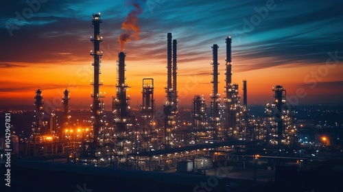 Industrial oil refinery complex with tall metal towers and bright lights on a clear day