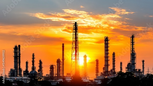 Industrial oil refinery silhouette against a vibrant sunset sky
