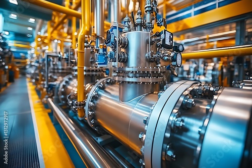 pipe, industrial, machinery, equipment, plant, factory, metal, steel, tube, yellow, industry, technology, engineering, manufacturing, infrastructure, energy, power, system, process, automation, complex, detailed, precision, heavy, setting, interior, scene, background, photo, closeup, detail, texture, bright, metallic, shiny