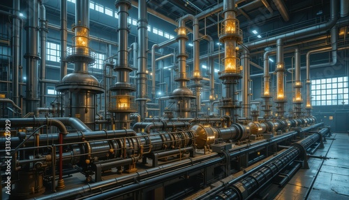Industrial Pipeline System in Modern Factory with Ambient Lighting