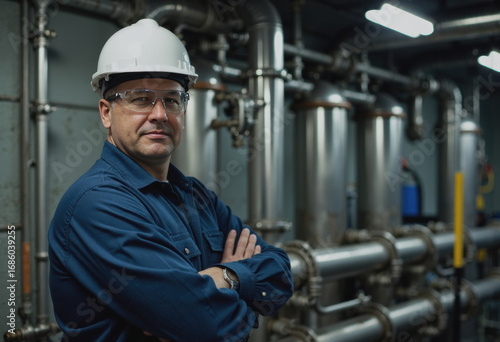 Industrial plant specialist standing confidently near chemical equipment