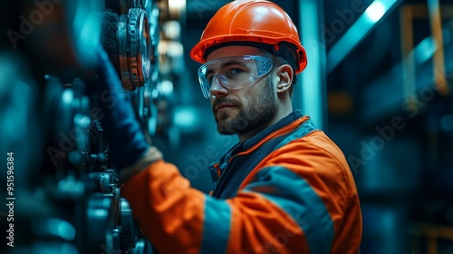 Industrial Precision: Engineer meticulously inspects machinery in a high-tech manufacturing plant, showcasing expertise and focus in a blue-collar profession.