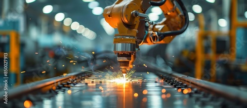 Industrial Robotic Arm Welding in a Modern Factory Setting with Sparks Flying, Showcasing Advanced Automation Technology and Precision Engineering in a High-Tech Manufacturing Environment