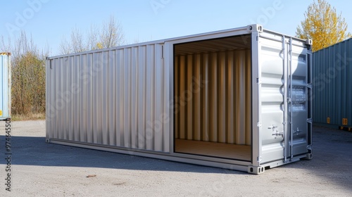 Industrial shipping container with an open door, showcasing spacious interior and weather-resistant design.