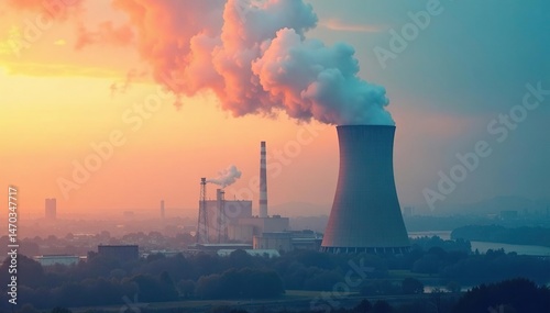 Industrial smog cooling tower emitting vapor against a hazy sky , environmental impact, heat dissipation