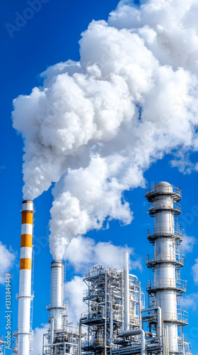 smoke, pollution, industry, refinery, factory, emission, air, environment, climate, change, industrial, plant, stack, chimney, sky, blue, white, cloud, energy, power, manufacturing, production, chemical, petrochemical, oil, gas, combustion, fume, vapour, atmosphere, global, warming, carbon, dioxide, greenhouse, gas, contamination, toxic, hazard, ecology, sustainability, impact, effect, problem, solution, technology, clean