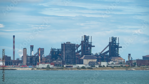 .Industrial steel plant with smokestacks and complex structures, seen across water under a cloudy sky
