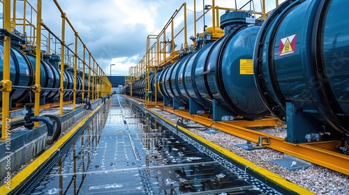 industrial, storage, tank, facility, modern, cloud, afternoon, technology, equipment, construction, line, safety, oil, energy, blue, infrastructure, container, environment, maintenance, engineering, design, machinery, service, transport, liquid, pipe, yellow, hazard, metal, contrast, landscape, platform, area, industry, production, measure, innovation, manufacturing, operational, generative, ai
