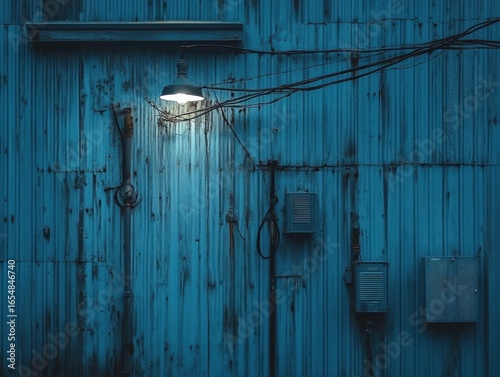 teal, corrugated, metal, wall, night, industrial, exterior, structure, darkness, light, lamp, fixture, wire, cable, electricity, power, connection, hardware, paneling, blue, evening, urban, building, architecture, retro, detail, texture, rough, rusted, aged, lighting, illumination, line, shadow, toned, grey, brown, grayish, steel, component, electrical, equipment, vintage