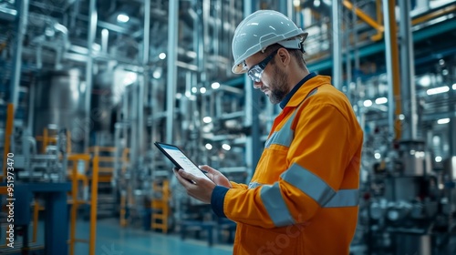 industrial, technician, tablet, factory, modern, manufacturing, production, automation, men at work, engineer, technology, inspection, maintenance, safety, helmet, goggles, machinery, industrial plant, digital, datum, process, monitoring, control, innovation, industry, workplace, skilled, expertise, efficiency, logistic, future, progress, operation, workflow, robotic, smart, industrial revolution