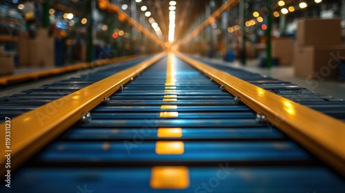 Industrial warehouse interior showcasing conveyor system with focused light and vibrant colors, representing efficiency and productivity in logistics operations.