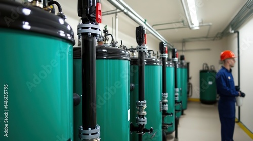 industrial, water, treatment, facility, tank, cylindrical, teal, green, pipe, maintenance, technician, engineering, technology, equipment, machinery, plant, factory, system, process, filtration, purification, industry, manufacturing, work, men at work, man, safety, helmet, uniform, building, interior, room, hallway, professional, operation, industrial plant, clean, modern, pressure, vessel
