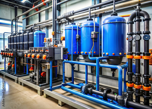 Industrial Water Treatment Plant: A complex system of orange and blue water treatment tanks, pipes, and valves in an industrial setting.