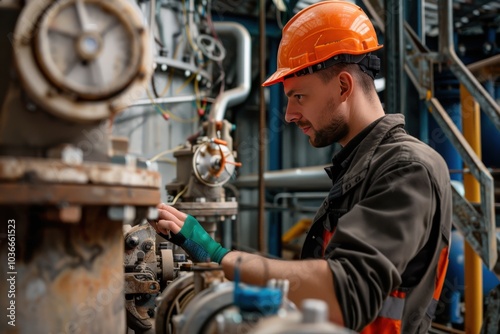 men at work, industrial, machinery, factory, setting, inspection, maintenance, safety, helmet, orange, hard hat, glove, green, hand, pipe, metal, steel, valva, gear, equipment, bolt, nut, wire, cable, plant, process, manufacturing, production, technology, automation, engineering, technician, labor, industry, job, blue, grey, brown, rust-eaten, background, sharpened, blurry, foreground, portrait, side, sideview, closeup, man