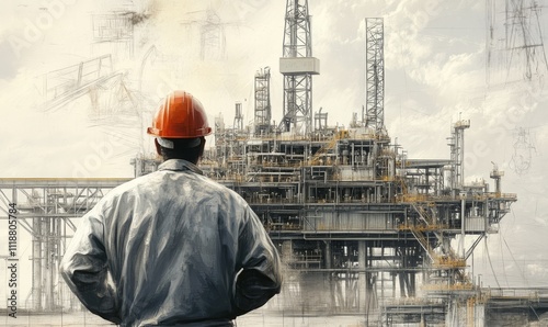 Industrial Worker Overlooking Oil Rig with Engineering Sketches