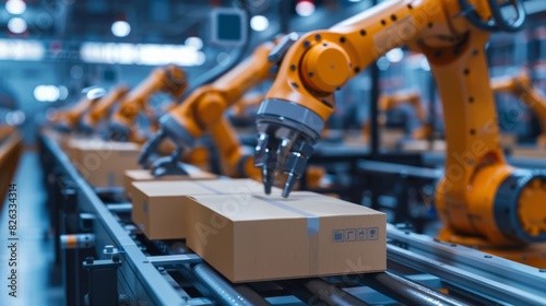 Industrie 4.0 Modern Factory: Fully Automated Warehouse Robotics: Robot arm packing metal components into cardboard boxes. Production line machines pick and pack product into packaging.