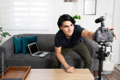 blog, video, recording, broadcast, home, freelance, 20s, adult, young adult, people, lifestyle, cyberspace, follower, audience, technology, hispanic, latin, living room, 1, expert, man, coach, laptop, camera, setup, setting up, preparation, online