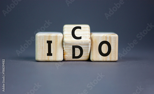 Initial coin or DEX offering symbol. Concept words abbreviation ICO or IDO on wooden block. Beautiful grey table grey background. Business Initial coin or DEX offering concept. Copy space.