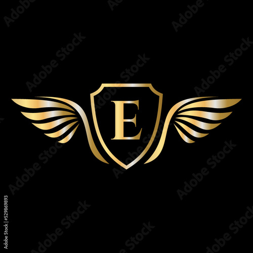 Initial Wing Logo On Letter E Alphabet For Transportation Logo Symbol