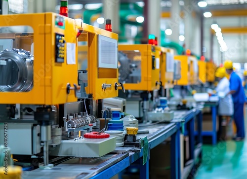Injection molding machines creating plastic parts, assembly line workers, modern plastic manufacturing facility