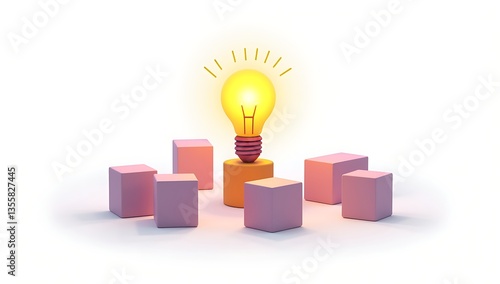 Innovation and Idea Generation Concept. Lightbulb Icon on a Central Wooden Block Surrounded by Smaller Cubes, Symbolizing Creativity and Brainstorming