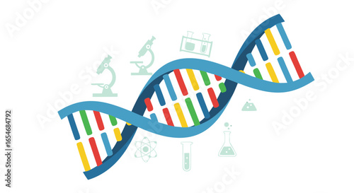 Innovative artistic interpretation of DNA structure with colorful nucleotide sequencing and scientific laboratory elements in background emphasizing