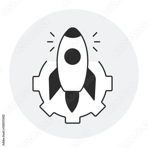 Innovative Execution. Flat-outline icon of rocket and gear symbolizing innovation, startup action, and creative business execution.