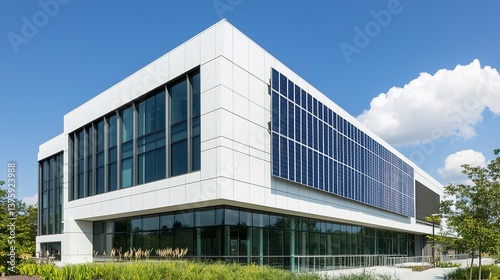 Innovative sustainable office building with solar panels urban environment architecture modern design