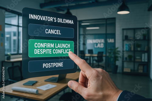 Innovator dilemma concept with hand selecting confirm launch option on digital interface in modern office environment