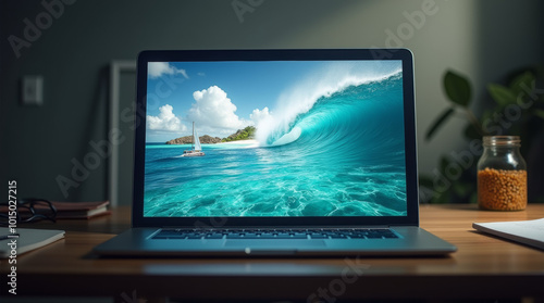 laptop, technology, nature, sea, island, vacation, creativity, travel, water, boat, relaxation, graphic design, wanderlust, sun, recreation, home office, inspired, screen, sustainability, palm, coast, art, photo, recreation, daylight, blue skies, liberty, adventure, lifestyle, workplace, mindfulness