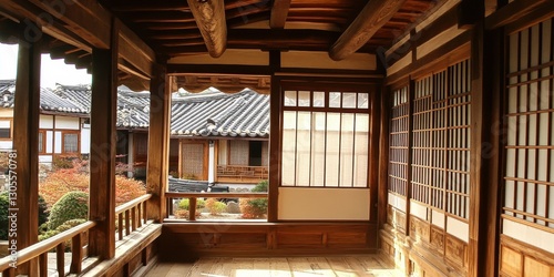 wood, architecture, building, structure, design, beam, pillar, post, frame, panel, ceiling, window, door, view, garden, landscape, tree, plant, autumn, foliage, traditional, culture, heritage, asian, pattern, grid, lattice, sunlight, shadow, perspective, interior, outside, exterior, daylight, natural, wooden, horizontal, symmetry, calm, peaceful, open, shelter, veranda, porch, balcony, roof, stone, tile