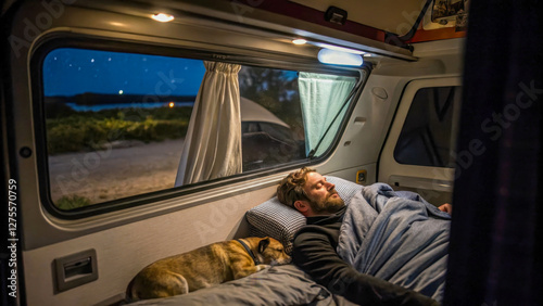 Inside the camper, a man sleeps peacefully next to his faithful dog. The interior is cozy dark, creating an atmosphere of peace and safety.
